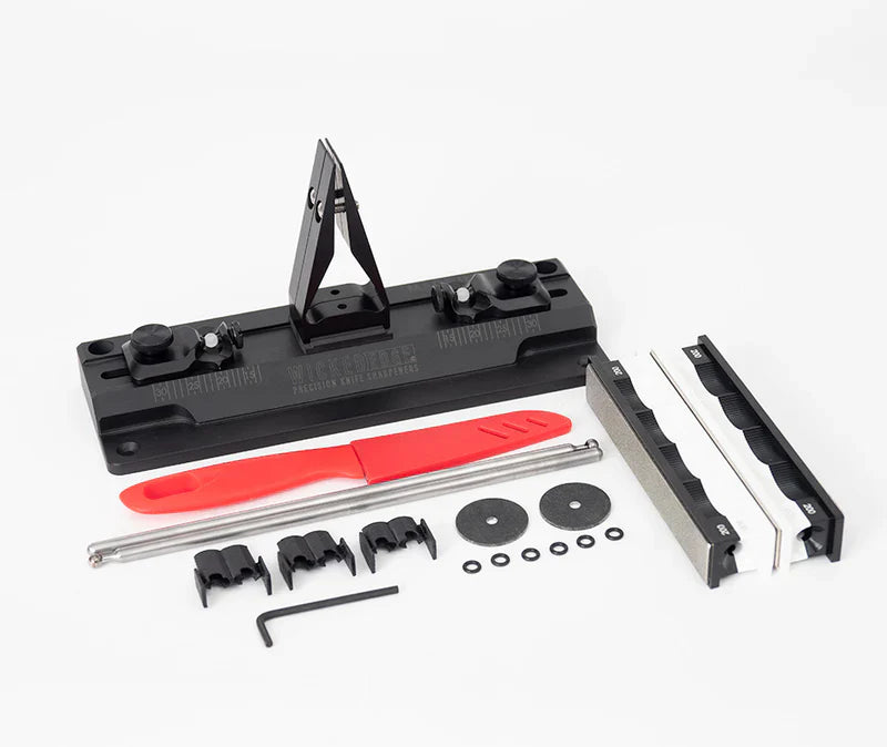 Comes with a 200/600 Grit Diamond Stone Pack (2 each), Injection molded glass-filled nylon base, Type 2 Anodized Standard Vise, 22.23 cm (8.75") Stainless Steel Guide Rods, Depth Stop in 3 sizes, 1/8" Allen Wrench, Alignment Guide, Practice Knife (note: the knife shown in images is not included), and a full YouTube instructional playlist